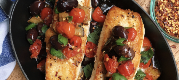 Seared Halibut with Eggplant, Tomatoes & Olives