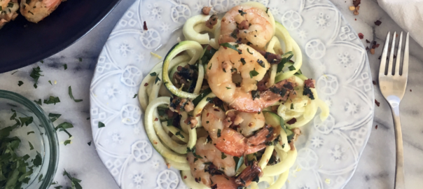 Shrimp & Pancetta in Spicy Garlic Sauce with Zoodles