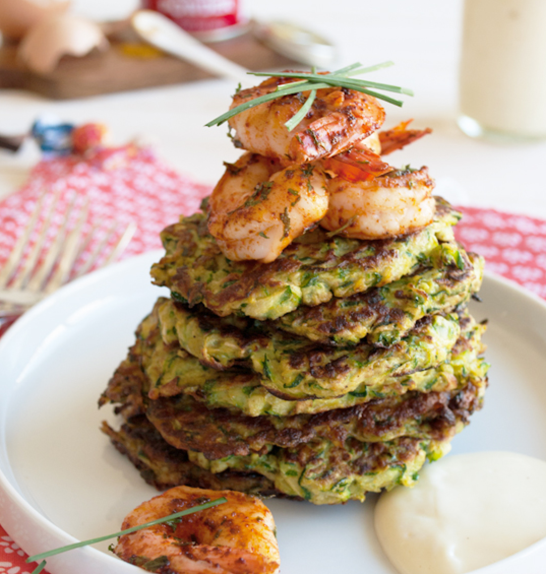Serve the shrimp on top of the curried zucchini fritters and add some salad on the side.