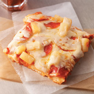 Blend the cottage cheese and egg together in a food processor or blender until the mixture is smooth. Add ingredients to the pre-baked crust in this order: tomato sauce, cottage cheese / egg, mozzarella, canadian bacon, pineapple and green pepper.