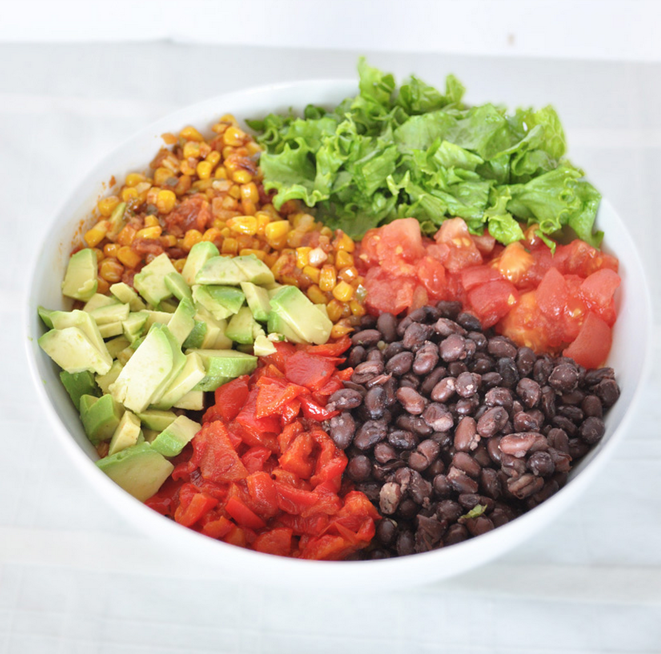 I added some avocado to mine. I also used about 2 cups chopped lettuce and 2 cups black beans. You can prep the tomatoes and peppers in advance and add them later if this is too much at once. I used some of the roasted tomatoes in the corn salsa. That 1/4 cup goes a long way in the corn salsa.