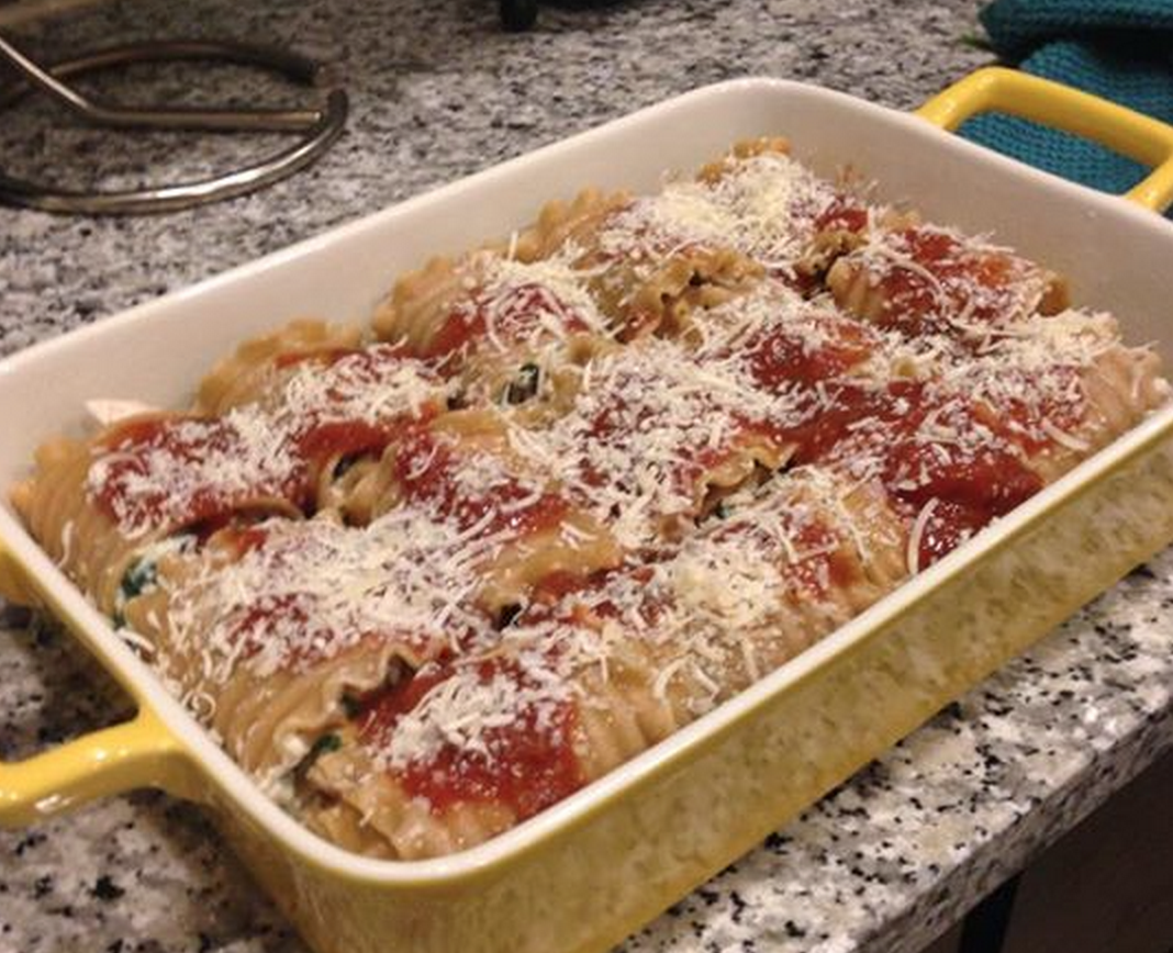 Place a piece of wax paper on the counter and lay out lasagna noodles. Make sure noodles are dry by patting them with a paper towel. Take 1/3 cup of ricotta mixture and spread evenly over a noodle. Roll carefully and place seam side down onto the baking dish. Repeat with remaining noodles.