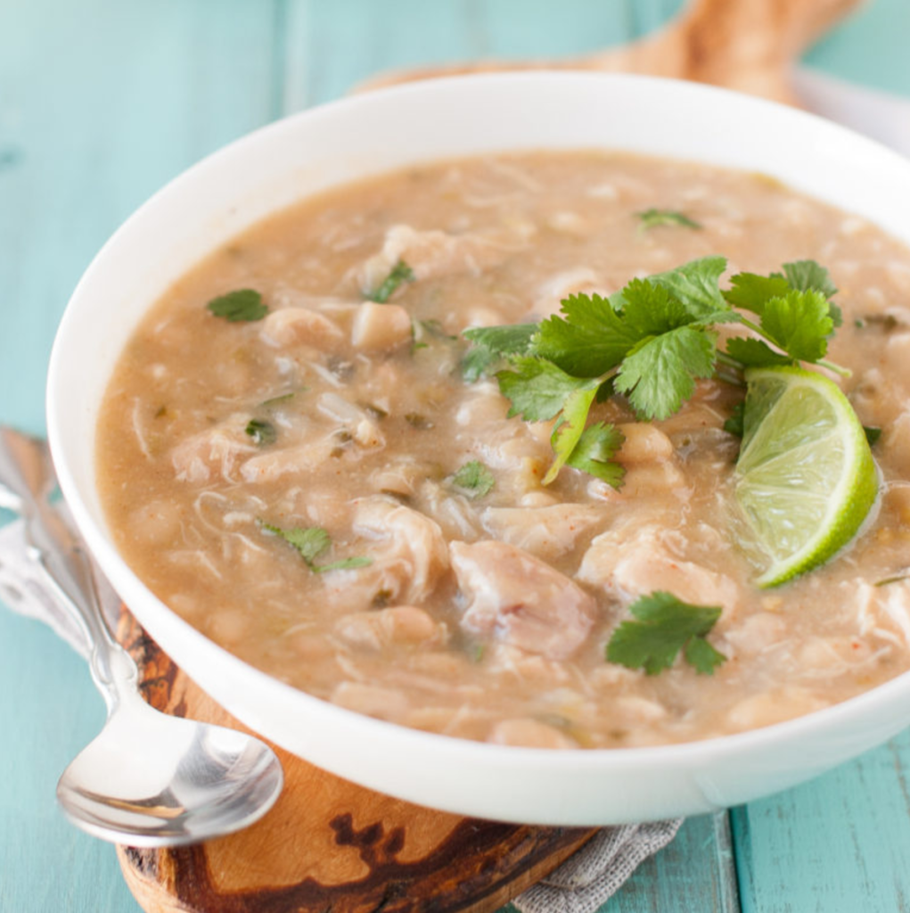 Place the chicken thighs, beans, chilies, onion, garlic, cumin, chili powder, pepper, salt, chicken broth, and coconut milk in a crock pot. Cook on high for 5-6 hours, or until chicken is very tender.