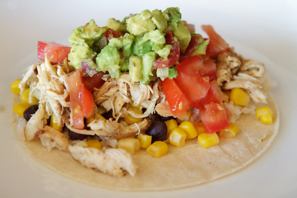 Warm tortillas so they are pliable. Layer corn, beans, chicken, tomatoes, and avocado.